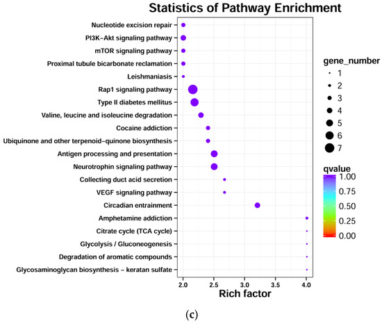 KEGG pathway enrichment of target genes for DEMs in different comparison groups. (a) KEGG pathway enrichment of target genes for DEMs in d30 vs. d60; (b) KEGG pathway enrichment of target genes for DEMs in d30 vs. d90; (c) KEGG pathway enrichment of target genes for DEMs in d60 vs. d90.