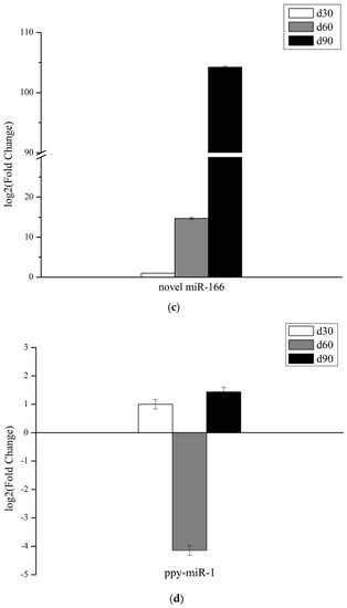 In terms of differentially expressed miRNAs, there were 3419, 3719, and 3665 in the d30 vs. d60, d30 vs. d90, and d60 vs. d90 comparison groups, respectively. Specifically, in the 30d vs. 60d comparison group, up-regulated DEMs predicted 1189 target genes, and down-regulated DEMs predicted 2663 target genes. In the d30 vs. d90 comparison group, up-regulated DEMs predicted 3308 target genes, and down-regulated DEMs predicted 730 target genes. In the d60 vs. d90 comparison group, up-regulated DEMs predicted 3603 target genes, and down-regulated DEMs predicted 115 target genes.