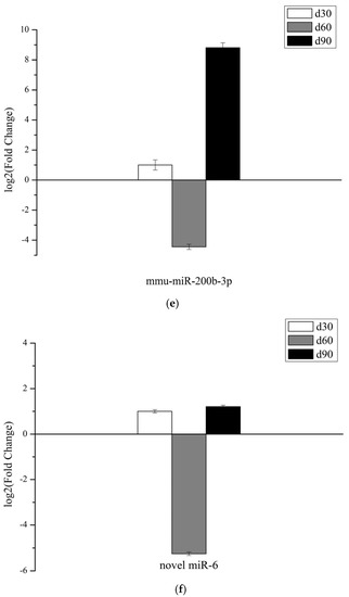 The purpose of this study was to deep sequence for miRNAs in velvet antler growth centers at different growth stages. In total, 292, 102, and 60 miRNAs were found to be differentially expressed in the d30 vs. d60, d30 vs. d90, and d60 vs. d90 comparison groups, respectively. Furthermore, 10 miRNAs were differentially expressed in the d30 vs. d60 and d60 vs. d90 comparison groups but not in the d30 vs. d90 group, among which four differentially expressed miRNAs (ppy-miR-1, mmu-miR-200b-3p, novel miR-6, and novel miR-94) with high expression levels in the antler growth center of 30 and 90 days and low expression in the antler growth center of 60 days. Meanwhile, the reverse was true for another miRNA (novel miR-10). Given that miRNAs typically function by down-regulating the expression of their target genes [31], five differentiated miRNAs were screened, which could play important roles in the rapid growth of velvet antlers. Further validation is required to determine whether miRNAs that are highly or lowly expressed in antler growth centers at 60 days of growth promote antler cell proliferation by suppressing the expression of their target genes.