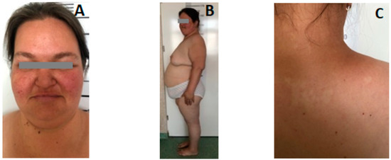 The patient presents facial dysmorphism: round facies, double chin, facial cutaneous angiomas and more extended sebaceous adenomas in the malar area, the cheekbones, nasolabial folds, and nasal pyramid; high forehead, deep set eyes, thin lips; excessive subcutaneous tissue in thorax, abdomen and limbs, with an abdominal skinfold of 5–6 cm; weight: 90 kg (+2 SD), height: 162 cm (percentile 50–25) (Figure 1A,B).