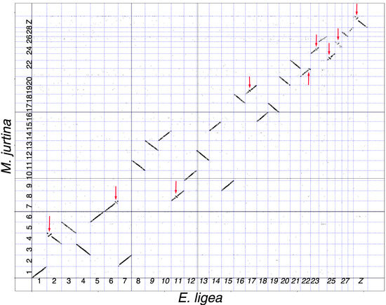 Genome of E. ligea (horizontal axis) plotted against genome of M. jurtina (vertical axis). It can be seen that chromosome 1ligea corresponds to chromosome 1jurtina, chromosome 2ligea corresponds to chromosome 4jurtina, chromosome 3ligea corresponds to chromosome 5jurtina, chromosome 4ligea corresponds to chromosome 3jurtina, and so on, and chromosome Zligea corresponds to chromosome Zjurtina. Each short stroke represents a single syntenic block (a supported alignment), positioned according to its position in the genomes of the compared species. All compared chromosomes are syntenic. Twenty pairs of chromosomes are collinear. Nine pairs of chromosomes show the presence of inversions (shown by red arrows).