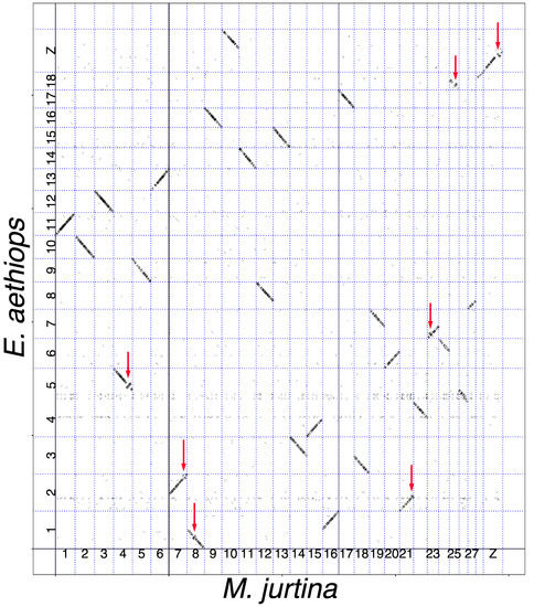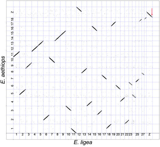 Genome of E. ligea (horizontal axis) plotted against genome of E. aethiops (vertical axis). It can be seen that chromosome 1ligea corresponds to chromosome 11aetiops, chromosomes 2 + 24ligea correspond to chromosome 5aethiops, chromosome 3ligea corresponds to chromosome 9aethiops, chromosome 4ligea corresponds to chromosome 12aethiops, and so on, and chromosomes 12 + Zligea correspond to chromosome neo-Zaethiops. Each short stroke represents a single syntenic block (a supported alignment), positioned according to its position in the genomes of the compared species. The red arrow indicates a small terminal inversion in the Z chromosome.