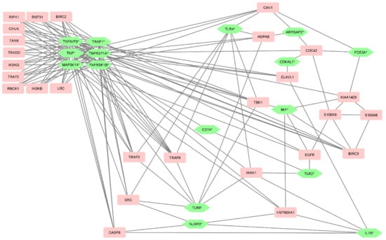 Gene ontology analysis of the genes listed in Table 3 showed few significant results, but their extended list containing BIOGRID interactors revealed several enriched GO terms. The genes and their interacting nodes are visualized in Figure 4. Many highly significant enriched GO terms are related to NF-kappaB signaling and TNFα, the most significant being I-kappaB kinase/NF-kappaB signaling (p = 2.76 × 10−37). Other significant terms include death-inducing signaling complex assembly (p = 4.67 × 10−15) and TRIF-dependent Toll-like receptor signaling pathway (p = 1.28 × 10−25).