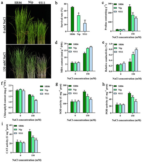 SR86 is a highly salt-tolerant rice germplasm resource originally identified in China [20]. We compared the salt tolerance of SR86 with that of the japonica rice Nip and indica rice 9311 grown in 150 mM NaCl. SR86 showed a greater salt tolerance (Figure 1a) and significantly higher survival rate and chlorophyll content (Figure 1b,f) compared with Nip and 9311.