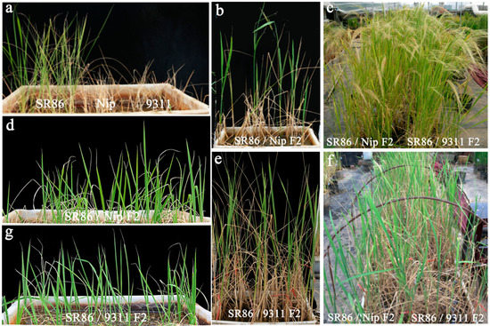 The phenotypic and genetic analyses of SR86 under salt stress. (a) Phenotype of SR86, Nip, and 9311 plants exposed to 150 mM NaCl. (b) Phenotype of SR86 × Nip F2 plants grown in the presence of 150 mM NaCl during the reproductive growth period. (c) Phenotype of SR86 × Nip F2 plants and SR86 × 9311 F2 plants under normal conditions. (d) Phenotype of SR86 × Nip F2 plants at seedling stage in the presence of 150 mM NaCl. (e) Phenotype of SR86 × 9311 F2 plants grown in the presence of 150 mM NaCl during the reproductive growth period. (f) Phenotype of SR86 × Nip F2 plants and SR86 × 9311 F2 plants under 150 mM NaCl conditions. (g) Phenotype of SR86 × 9311 F2 plants at seedling stage in the presence of 150 mM NaCl.