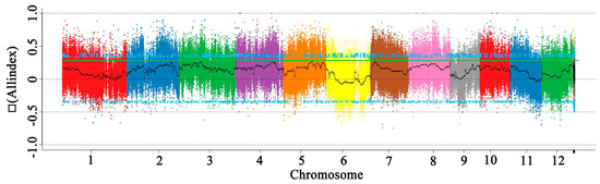 The distribution of Δ(All−index) on the chromosomes of two F2 populations. The x−axis indicates chromosome length (Mb) and the y-axis indicates Δ(All−index).