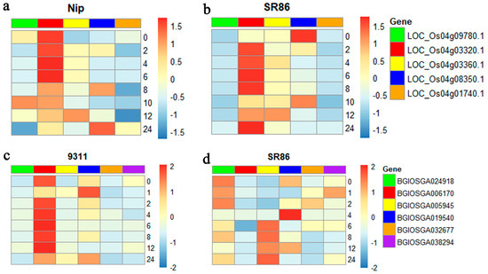 To verify whether the candidate genes responded to salt stress, the expression levels of these genes were investigated in SR86, Nip, and 9311 plants by RT-qPCR. The results showed that the expression of LOC_Os04g03320.1, LOC_Os04g03360.1, and LOC_Os04g08350.1 was higher in the SR86 plants than in Nip plants and the expression of LOC_Os04g03320.1 in SR86 increased by 1000-fold within 24 h (Figure 7a,b). This suggests that LOC_Os04g03320.1 plays a crucial role in the salt tolerance of SR86. Similarly, BGIOSGA005945, BGIOSGA024918, BGIOSGA019540, BGIOSGA032677, and BGIOSGA038294 were expressed to higher levels in SR86 plants than in 9311 plants (Figure 7c,d). However, the expression of BGIOSGA019540 in SR86 was significantly higher than that in 9311 after 4 h of salt stress treatment (Figure 7c,d), suggesting that BGIOSGA019540 is critical for the salt tolerance of SR86.