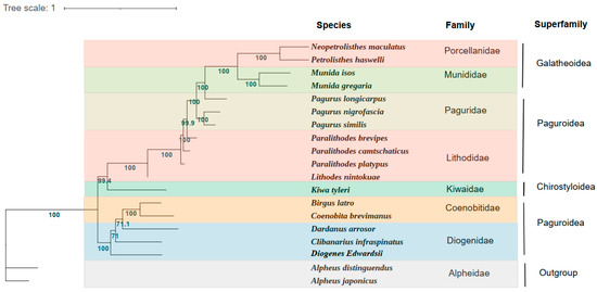 The infraorder Anomura is a collection of diverse crustaceans placed within the Decapoda with over 2500 species [8]. Anomura species have an exceptional range of body forms and can be found in diverse habitats including hydrothermal vents, freshwater bodies, and terrestrial environments [9]. The latest classification scheme divides Anomura into seven superfamilies: Aegloidea, Chirostyloidea, Galatheoidea, Hippoidea, Lithodoidea, Lomisoidea, and Paguroidea. Hermit crabs (the superfamily Paguroidea Latreille, 1802) are one of the best known and most diverse consisting of Coenobitidae, Diogenidae, Paguridae, Parapaguridae, Pylochelidae, and Pylojacquesidae, with more than 1100 species inhabiting diverse biotopes from intertidal to deep seas [10]. The hermit crabs represent an intermediate group of crustaceans from Macrura to Brachyura, which occupy a key position in crustacean evolution [11]. These species are unique because they have asymmetrical bodies that allow them to live in gastropod shells. However, merely a few of the evolutionary relationships of hermit crabs at taxonomic levels have been investigated, which are still waiting for researchers to further resolve [12,13,14].