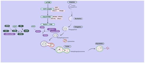 Furthermore, the aforementioned conjugations lead to autophagophorematuration and then the (iv) fusion step follows, by which lysosomes are united with autophagosome, forming autophagolysosome, which is subject tothe last step:(v) degradation [7]. We present a schematic presentation of the macroautophagy pathway in Figure 1.