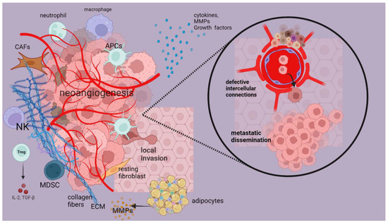 TME is a dynamic system surrounding amalignant tumor thatis comprised of a wide variety of tumor-secreting molecules and cells, while it has a pivotal role in resistance to therapeutic modalities, intravasation, and extravasation of tumor cells, as well as in neoangiogenesis and metastatic dissemination of malignant cells [8]. In this section, we will shed light on the role of each TME component and its implication in tumor progression.