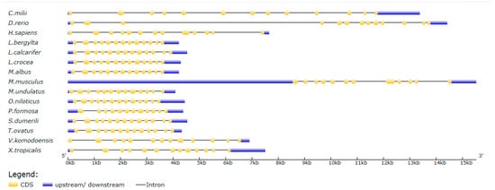 MMP9 Gene structure of Callorhinchus milii, Danio rerio, Homo sapiens, Labrus bergylta, Larimichthys crocea, Lates calcarifer, Melopsittacus undulatus, Monopterus albus, Mus musculus, Oreochromis niloticus, Poecilia formosa, Seriola dumerili, Trachinotus ovatus, Varanus komodoensis, Xenopus tropicalis.