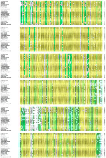 Multiple alignment of the deduced amino acid sequences of MMP9 in T. ovatus and other bony fishes. The homology level is highlighted, with yellow indicating more than 50% homology and green indicating more than 33% homology.