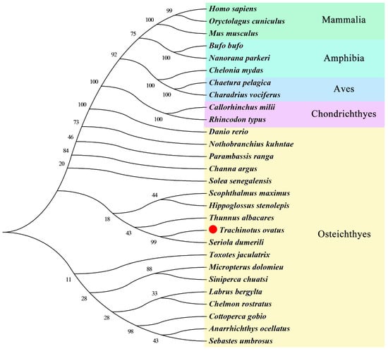 The DNA and cDNA sequences of T. ovatus MMP9 were obtained from the genome database [28]. Amino acid sequences were inferred from the Editseq module of the DNAstar software. Online tool SMART (http://SMART.embl-heidelberg.de/, accessed on 18 June 2022) was used to analyze the protein domains; Predict signal peptides using SignalP 5.0 (http://www.cbs.dtu.dk/services/SignalP/, accessed on 18 June 2022); GSDS 2.0 (http://GSDS.gao-lab.org/, accessed on 18 June2022) was used to predict gene structure; Multiple sequence homology comparisons between T. ovatus and other species were performed using DnaMan 9 software; and the maximum likelihood algorithm of Mega 7 software was used to construct a phylogenetic tree.