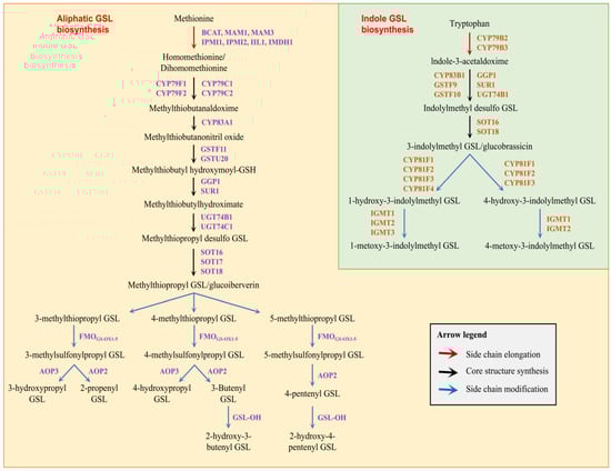 Structurally, all GSLs comprise a β-D-glucopyranose residue linked through a sulfur atom to a (Z)-N-hydroximinosulfate ester plus an R side-chain group derived from an amino acid (AA). Based on different AA sources of R groups, GSLs can be divided into three categories: aliphatic GSLs (R side chains are derived from methionine, alanine, valine, leucine, and isoleucine), aromatic GSLs (R side chains are derived from amino acids containing aromatic rings, tyrosine, and phenylalanine), and indole GSLs (R side chains are derived from tryptophan). The GSL synthetic pathway has been thoroughly studied in the model plant Arabidopsis thaliana [20,21,22,23,24,25,26,27,28,29,30,31,32,33,34,35,36,37,38]. The biosynthesis of glucosinolates can be summarized into three stages: extension of the R side chain, synthesis of the core structure, and modification of the side chain [39] (Figure 1) Figure 1 is quoted from references [40,41].