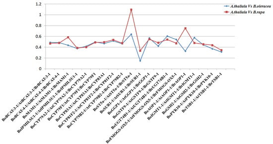 To analyze the evolutionary relationships of glucosinolate biosynthesis homologous gene pairs among A. thaliana, B. oleracea, and B. rapa, we compared the non-synonymous/synonymous (Ka/Ks) ratios of GBGs (Figure 4). The Ka/Ks ratio expresses the selective pressure on the evolution of genes [46]. Two genes (BoST5a and BoAOP1) significantly differed in orthologous gene pairs between A. thaliana–B. oleracea and A. thaliana–B. rapa. The KA/KS ratio of BoST5a in B. rapa was above one, indicating that it had undergone positive selection. Conversely, the KA/KS ratio of BoST5a in B. oleracea was below one, indicating that it underwent negative selection during evolution. For both BoAOP1 and BrAOP1, the ratio was below one. However, more negative selection occurred in B. rapa. The Ka/Ks ratios of BoGUT74B1, BoFMOGS-OX5, and BoGTM1 were all below one, there are more positive selection occurred in B. oleracea compared to B. rapa. The remaining homologous genes such as BoBACT-3 and BrBACT-3, BoCYP83A1, and BrCYP83A1 are closely underwent negative selection during evolution. Therefore, we speculated that BoGBGs and BrGBGs underwent different selective pressures.