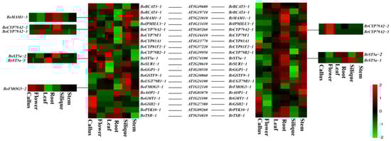 The expression levels of BoGBGs and BrGBGs in different tissues (callus, flower, leaf, root, silique, and stem) were analyzed based on a publicly available transcriptomic dataset. The transcript levels of 133 glucosinolate biosynthetic genes were assessed (Table S2). From the heatmap visualization, 20 BoGBGs and BrGBGs, which were important for glucosinolate synthesis, were expressed (Figure 5). Seven of these genes had the highest and lowest expression levels in the siliques and roots, respectively: BoUGT79B1-1, BoFMOG5-1, BoSUPR1, BoBCAT-4-1, BoMAM1-1, BoCYP83A1-1, and BoCYP79F1. By contrast, the expression levels of BoAOP1-1, BoPYK10-,1 and BoTBS-1 were highest in the roots and lowest in the siliques. Some genes were highly expressed in cabbage leaves, such as BoBCAT-3-1, BoCYP79A2-1, BoCYP79B2-1, BoST5a-1, and BoGSTF9-1. BoCYP81F2-1, BoGMT1-1, and BoGSH2-1 were barely expressed, except in the callus. BoST5a-1 had the lowest and highest expression levels in the stems and leaves, respectively. BoST5a-2 was expressed in all tissues and had the highest and lowest expression levels in the roots and flowers, respectively. BoAOP1-1 had the highest expression levels in the roots and stems.
