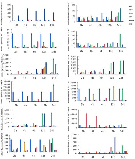The expression of glucosinolate biosynthetic genes after treatment with exogenous phytohormones. The Y and X axes represent the relative expression level and time course of exogenous phytohormone treatment, respectively. Leaves were sampled 2, 4, 6, 12, and 24 h after H2O(CK), ethylene (ETH), abscisic acid (ABA), salicylic acid (SA), strigolactone (SL), and methyl jasmonate (MeJA) application. The values represent the mean ± SD of three technical replications.