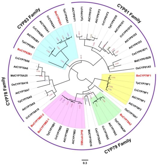 The cytochrome P450 gene family is important for plant development as it is largely involved in the synthesis and metabolism of plant hormones, pigments, and fatty acids. In this study, P450 genes were identified in B. oleracea and six other representative plant species. As shown in Figure 8, 48 genes clustered into four clades (CYP78, CYP79, CYP81, and CYP83). BoCYP83A1 and BoCYP83B1 clustered with the CYP83 family (blue area), whereas BoCYP79F1, BoCYP79A2, BoCYP79B3, BoCYP79B2-1, and BoCYP79B2-1 clustered with the CYP79 family (yellow, green, and pink area).