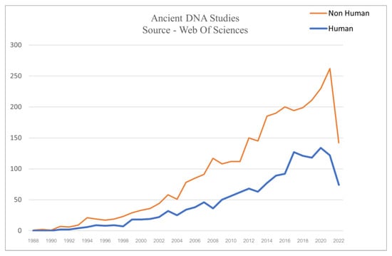 Most commonly, the fields comprising aDNA analysis are also known as palaeogenomics or archaeogenomics. While the number of studies employing aDNA over the past few decades has substantially escalated, in this context, the present study notably managed to illustrate the trend of aDNA studies consisting of human and non-human samples (Figure 1 and Figure 2).