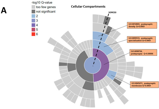 SynGO (https://syngoportal.org/) (accessed on 20 January 2022) was used to perform an overrepresentation analysis of the SORCS3 gene-set using an evidence-based, expert-curated resource of gene ontology terms for synapse function [53]. A “brain expressed” background set of genes was selected for gene-set enrichment analysis (GSEA); it contains 18,035 unique genes in total, of which 1225 overlap with SynGO annotated genes. The GSEA only tested SynGO terms with at least three matching input genes.