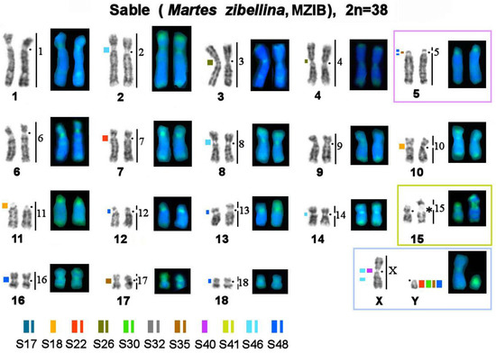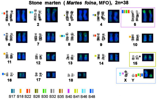 The Mustelidae family unites animals that are diverse in morphology and behavior, belongs to the Caniformia suborder, and is one of the most specious in the Carnivora order [33]. Karyotypic studies of the genus Martes (Mustelidae) have revealed high conservatism of syntenic groups and similar G-banding patterns for many elements in chromosome sets among mustelids, raccoons, and cats [34,35]. Fluorescence in situ hybridization (FISH) has confirmed high conservatism of the euchromatin fraction among martens’ genomes in contrast to variation of the heterochromatin content. A comparison of human and domestic ferret karyotypes has uncovered a low number of conserved segments in total (32) [36,37,38,39,40] as compared to highly rearranged karyotypes (68) in the domestic dog [41,42].