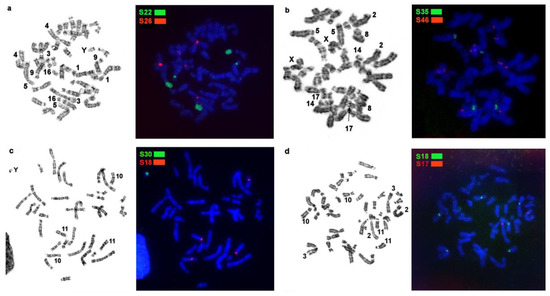 The MSRs utilized in this work may be subdivided into several groups (Table 3): 1. Stone marten–specific (S32 and S41), which were not found in the three other species. The remaining nine macrosatellites are present in the genomes of all four studied representatives of Martes. 2. Autosome-specific (S17, S18, and S26). 3. X chromosome-specific (S40). 4. Diverse: MSRs that were detected in centromeric regions of several autosomes, short arms of some autosomes, and one of the sex chromosomes (S22, S30, S35, S46, and S48). These species were found to differ in the location, fluorescent-signal intensity, number, and size of clusters of repeated sequences; in fact, each species has its own unique chromosomal “portrait” due to the diversity of the heterochromatin component (Figure 4, Figure 5 and Figure 6). We did not observe the heteromorphism of macrosatellite signals within each of the studied animals.