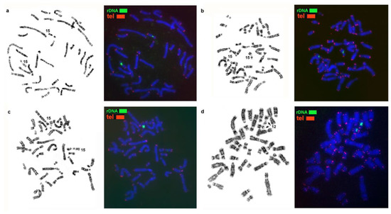 Here genome-wide homology maps of the stone marten and of the three other analyzed species were supplemented with information on the localization of ribosomal genes, telomere repeats, and MSRs. Clusters of rDNA are located on one chromosome pair in all the species under study: on autosome 15 of the stone marten and on homologous elements in genomes of the three other Martes species. Heteromorphism of the size of ribosomal gene clusters was found among the analyzed animals (Figure 3 and Figure 7).