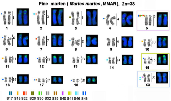 Whole-chromosome sorted painting probe libraries of the stone marten were used for FISH analyses of genomes of the sable and pine marten. The set of stone marten chromosome-specific painting probes has been described previously [39,43]. Amplification and labeling of a plasmid containing 18S, 5.8S, and 28S ribosomal DNA (rDNA) probes for detecting NORs and a probe containing telomeric sequences have been described in detail earlier [44].