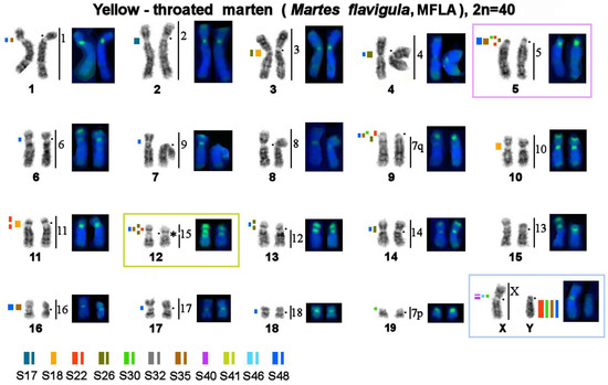 To compare macrosatellite markers on homologous syntenic groups among the four Martes species, we relied on cross-species comparative painting data with whole-chromosome sorting probes from the stone marten. A genome-wide homology map between the stone marten and yellow-throated marten was created earlier [39]. These data indicated high chromosome conservatism and only one interchromosomal rearrangement—Robertsonian fission of MFO 7—in the karyotype of the yellow-throated marten. By means of the stone marten chromosome probes for the comparative painting of sable and pine marten chromosomes, we confirmed the earlier evidence of high chromosomal conservatism and one-to-one correspondence to stone marten chromosomes on the basis of comparative G-banding [34,35].
