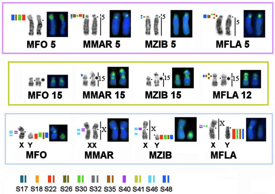Distributions of repetitive macrosatellite sequences in the genome of the pine marten. The metaphase plate was first stained with Giemsa after trypsin digestion for the G-banding and then restained with fluorescent dyes after formamide denaturation to reveal the composition of constitutive heterochromatin (CDAG-banding). Numbers on the right indicate homology with stone marten (MFO) chromosomes. A dot denotes a centromere position. * Clusters of ribosomal genes (NOR). The thickness of a colored line reflects the relative intensity of the fluorescent signal. Chromosomes homologous to stone marten autosomes 5 and 15 and sex chromosomes are marked with colored frames for the comparison that is shown in Figure 7.
