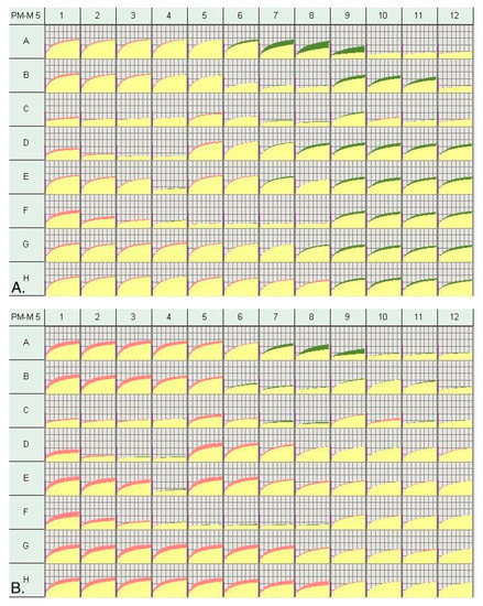 There was a large overlap between those who were high responders to IGF-1 and high responders to hGH, with 11 out of the 12 being the same individuals (Figure 2A). Heat maps of the top 20 significant wells for PM–M1 and PM–M5 showed the metabolic difference between high responders and the 50 control individuals (Figure 3A,B). It is interesting to notice how the high-responders (green in Figure 3A) are scattered in the heat map of PM–M1 (containing energy sources) but tightly clustered in the PM–M5 one, suggesting that the metabolic profile generated in response to ionic species may be a more reliable biomarker than the one detected in the presence of energy sources to select the high-responder subgroup in the PMS population. Analysis of the data from PM–M1 to M8 and TRP plates detected 290/776 (37.37%) significant wells in the high response hGH cohort and 293/776 (37.76%) in the high response IGF-1 cohort (Table 2) when compared to the control cohort. The high hGH responder cohort had eight wells that generated significantly lower levels of NADH than controls and the high IGF-1 responders had 10 wells significantly lower than controls. Between the two responder groups, 284 wells were significant for both high responder groups (Table 2).