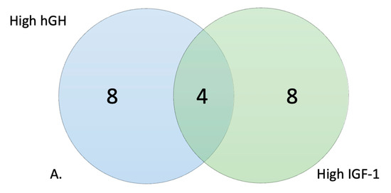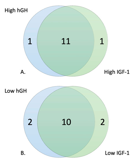 Since both hGH and IGF-1 have a direct influence on glucose metabolism, mimicking the anabolic effect of insulin, and because hypoglycemia is a potential side effect in individuals treated with IGF-1, we correlated the metabolic response to these two compounds to the baseline glucose metabolism. In the PM–M7 plate, the cells utilize glucose from the media to produce NADH in the presence of various metabolic effectors, including hGH (wells E1-E6) and IGF-1 (wells E7-E12), except for the first six wells (A1-A6), where no metabolic effector is present. We used these first six wells for each individual as controls, representing the baseline energetic metabolism of glucose. The data collected from the wells containing varying concentrations of hGH and IGF-1 were thus divided by the average of the six control wells, allowing us to observe how these compounds alter the baseline glucose metabolism in individuals with PMS. After adjusting for baseline glucose metabolism, the overlap between groups was lower, with the high responders having only 4 out of 12 individuals being the same between hGH and IGF-1, while 11 out of 12 were the same before correlation (Figure 5A). Similarly, the low responders had 7 out of 12 individuals that were the same as compared to the 10 out of 12 before the correlation (Figure 5B). The high responders had fewer overlap groups and were more different in terms of the cell lines selected for the top 25% based on the response to hGH and IGF-1. The low responders maintained a very sensitive overlap across hGH and IGF-1, having only three different cell lines from the initial group of 12 low responders. These results suggest that the primary metabolic effect exerted on the metabolic profile of PMS cells is not strictly connected to their influence on glucose metabolism.