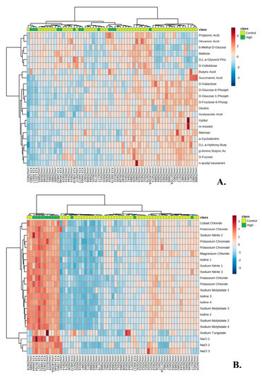 (A) Heat map of high responders and 50 control individuals’ metabolic response to the top 20 significant wells of plate PM–M1(energy sources). (B) Heat map of high responders and 50 control individuals’ metabolic response to the top 20 significant wells of plate PM–M5 (ionic species).