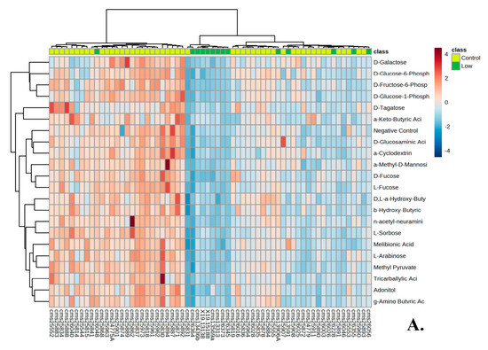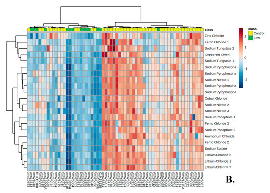 (A) Heat map of low responders and 50 control individuals’ metabolic response to the top 20 significant wells of plate PM–M1(energy sources). (B) Heat map of low responders and 50 control individuals’ metabolic response to the top 20 significant wells of plate PM–M5 (ionic species).