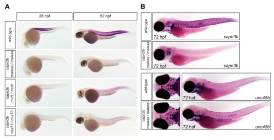 Given that CAPN3 mutations are a frequent cause of limb-girdle muscular dystrophy type R1 (LGMDR1) in humans [3], we sought to generate zebrafish mutants of CAPN3 orthologs in zebrafish. Because capn3a is expressed in the eye lens and not in muscles, we targeted the capn3b gene, for which there is evidence for tail musculature expression [13] and aortic arch smooth muscle staining [26] in zebrafish. However, the capn3b gene has not been studied in zebrafish in the muscle context until now. We used Clustered Regularly Interspaced Short Palindromic Repeats (CRISPR)/Cas9 strategies to generate an RNA-less (proximal promoter and exon 1) deletion mutant and a deletion mutant from exon 3 to 5 (Figure 1A). Both strategies were successful and, after the necessary breeding, the resulting homozygous mutants were verified by standard PCR genotyping and sequencing of the genotyping amplicons in wild-type and mutant embryos. The rnaless mutant allele was a 751-bp deletion, and the mut1 and mut73 alleles were a 33-bp insertion with a 467-bp deletion and a 608-bp deletion, respectively (Figure 1B). We then verified capn3b mRNA presence, size, and sequence in the wild-type and mutant embryos with three cDNA-level assays (Figure 1C). In order to confirm that the mutant transcripts or lack thereof correlate with the mRNA species predicted by genomic sequence deletion analysis, we designed three types of cDNA assays: a cDNA-del assay, a Rnaless-test assay, and a full-cDNA assay, which are RT-PCR assays with specific pairs of primers (Figure 1C). Homozygous capn3b rnaless mutants were negative for all of the cDNA assays, thus confirming the ability of this mutation to fully inactivate capn3b transcription (Figure 1C). cDNA-del assay used to verify the multi-exon deletion mutants indeed confirmed that mut1 and mut73 alleles result in smaller cDNA PCR products, whereas the RNA-less test assay resulted in comparable PCR products in all samples except the rnaless homozygotes (Figure 1C). Amplification of the whole capn3b cDNA with the full-cDNA assay in the wild-type and all capn3b mutants allowed determination of the exact translation consequences in mut1 and mut73 mutants, which both have a transcript with an in-frame 164-codon deletion, and mut1 homozygotes also have a transcript coding for a dramatically truncated protein (Figure 1C,D). These results are significantly different from the predictions made based on the genomic sequences from the mutants, which only suggested truncated proteins. The in-frame deleted transcript can be explained by the skipping of exon 2 and the deletion-generated hybrid exon 3/5, whereas the truncated protein transcript is due to the expected splicing. We then analyzed expression of capn3b by WMISH in the wild-type, capn3b−/− (rnaless), capn3bmut1/mut1, and capn3bmut73/mut73 embryos at 28 and 52 hpf and showed clear tail muscle expression of capn3b in the wild-type embryos, completely absent expression of capn3b in capn3b−/−, and dramatically reduced expression in capn3bmut1/mut1 and capn3bmut73/mut73 embryos (Figure 2A). In a separate and subsequent experiment, we stained capn3b mRNA in 3 dpf wild-type and capn3b−/− embryos, which confirmed capn3b expression in the tail musculature and branchial arch regions (Figure 2B). To assess whether lack of capn3b affects the development of particular muscle groups, we also stained wild-type and capn3b−/− embryos for the unc45b myosin chaperone gene expressed universally in the muscle [27] and showed that both the tail and ventral head musculature unc45b staining is normal in capn3b−/− embryos (Figure 2B). Adult capn3b mutants were also morphologically normal, viable, and fertile. As a result, we focused on the muscular phenotypes in larvae under challenge and did not pursue detailed observations and measurements of adults.