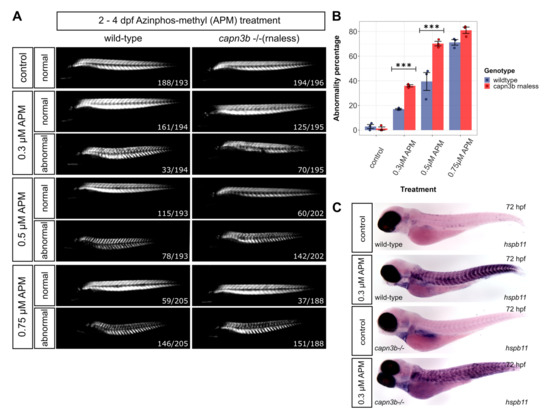 Although we obtained very relevant results on the increased susceptibility of capn3b mutants to muscle damage using MC treatments, working with methylcellulose solutions is cumbersome, precluding higher throughput analysis. This prompted us to explore other options to stimulate excessive muscle activity. Azinphos-methyl (APM) is an inhibitor of Acetylcholinesterase (AChE), known to control cholinergic neurotransmission in animals but may also have other roles [29]. APM application in zebrafish results in muscle hyperactivation (myotonia) due to persistently high levels of acetylcholine, and consequent muscle damage is easily detectable by the birefringence assay [29,30]. We reasoned that starting treatment later at 2 dpf and using low micromolar and sub-micromolar APM concentrations can help identify treatments to which wild-type and capn3b mutant embryos can be differentially sensitive. For this experiment, we used wild-type and capn3b−/− (rnaless) embryos and 0 (control medium with DMSO), 0.3, 0.5, and 0.75 µM APM treatments from 2 to 4 dpf (Figure 6A). Birefringence imaging and statistical analyses of the numbers of embryos with normal and abnormal muscles after APM treatments demonstrated that at 0.3 and 0.5 µM APM, there is a highly significant elevated susceptibility of capn3b−/− embryos to muscle damage due to hyperactivation by AchE inhibition, whereas in the control media both types of embryos are normal, and at 0.75 µM APM they both have similar rates of abnormal muscles (Figure 6B). To confirm the activity of APM treatments, we performed WMISH for the hspb11 cholinesterase inhibition marker on wild-type and capn3b−/− embryos treated with 0.3 µM APM and found qualitatively similar levels of induction (Figure 6C). This result further confirms that capn3b loss results in increased susceptibility to damage after muscle hyperactivation.