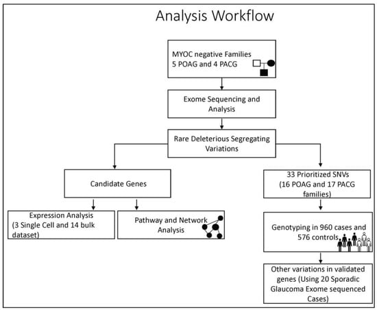 A total of 37 samples from 11 families were collected for the study. The individuals underwent ophthalmological examinations to determine glaucoma affection status. The mean age of the samples was 49 years, with the age range being 12 years to 80 years (Table S1). MYOC exons 1 and 3 screening led to identification of known mutations in two families. A p.Gln48His [18] variant in family F_10 and p.Thr353Ile [57] variant in family F_11 were found to co-segregate with the phenotype. In F_8 (individual III.3), a novel p.Glu409Asp variant was found which did not segregate with the phenotype (Figure S1). Thus, 31 samples from nine families were taken forward for exome sequencing (Figure 2) after excluding F_10 and F_11. This comprised 16 individuals from five POAG families and 15 from four PACG families. Twenty sporadic cases of glaucoma were also included for whole-exome sequencing.