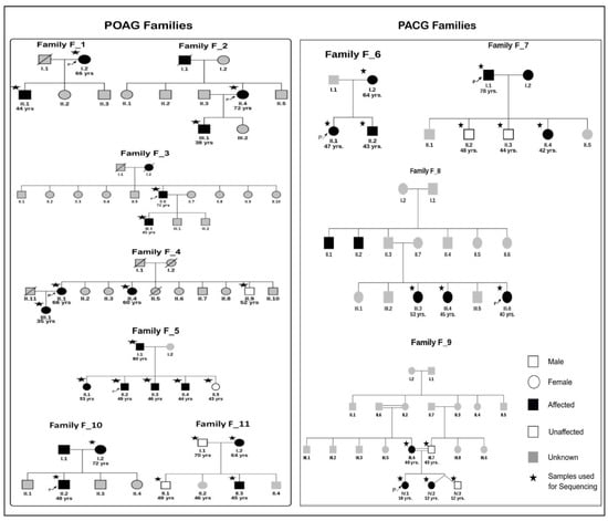 The pedigrees of seven POAG families and four PACG families used for exome sequencing. All individuals in white symbols have tested negative for glaucoma. The individuals in gray represent members with disease status unknown. Other symbols represent usual pedigree nomenclature. The arrow represents the proband and star * indicates the samples used for exome sequencing (Except families F_10 and F_11 were not exome sequenced as they had known MYOC mutations).