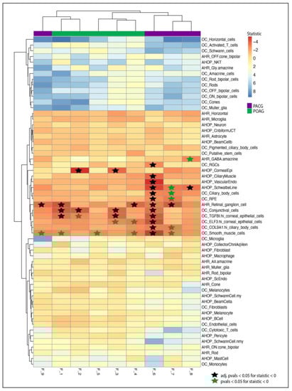 Heatmap showing t statistic for candidate genes expressed in eye tissue. Heatmap and clustering using the t statistic from the t-test of each cell type against all cell types from a study. Negative statistic (Red) represents enrichment of percent cells expressing candidate genes with respect to all tissues. The stars represent p value < 0.05 in tissues with negative statistic. The black stars represent adjusted p values (Bonferroni) less than 0.05. Blue stars represent significant p-values before adjustment.