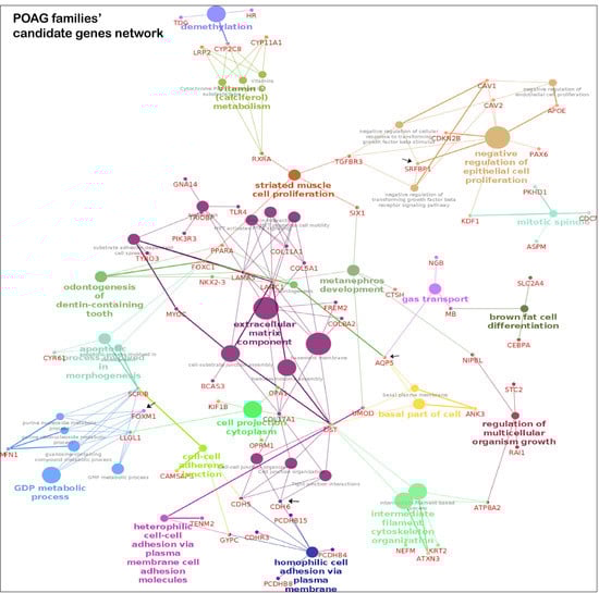 The single-cell analysis also identified enrichment in epithelial cells. Negative regulation of epithelial cell proliferation forms a hub in the network analysis, indicating the importance of epithelial cells in glaucoma. Together, the candidate genes contribute to larger networks, like extracellular matrix remodeling, inflammation and lipid metabolism, which already has a reported role in glaucoma. The known glaucoma pathways include eye development, lipid metabolism, inflammation, ECM organization, oxidative stress and senescence, etc. [63,64,65,66]. The ECM organization is implicated not only in trabecular meshwork, but it is also overrepresented in the lamina cribrosa, therefore the effect of potential pathogenic variations in the genes can impact functions of both anterior and the posterior parts of the eye. In PACG, lipid metabolism seems to play an important role. Though a high lipid level is not a risk factor for glaucoma, there are studies that have identified a relation between the two. Ultra-high-resolution metabolomics identified significant alteration in lipid-metabolism-related processes in POAG [67]. Dyslipidemia was found to be significantly associated with a high intraocular pressure [68], but not glaucoma. In another study, rabbits fed with a high-cholesterol diet resulted in features similar to glaucoma [69]. The rabbits suffered from a primary form of glaucoma as there were developmental defects in the filtration angle. Further, they report that the lesions in the eye tissues caused by hypercholesterolemia may have a role in deterioration of the disease. In addition, short-term use of statins, cholesterol lowering drugs, was associated with a decreased incidence of glaucoma [70]. There are several genes related to lipid metabolism that have been associated with glaucoma. These genes include ABCA1 [71,72], APOE [73], CAV1/CAV2 [74], OPA1 [75] and CYP1B1 [76]. These findings point to the role of cholesterol dysregulation in glaucoma and must be further probed.