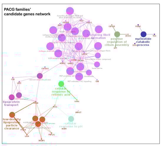 The key pathways in KEGG, WikiPathways and Reactome databases for the candidate genes in PACG families include ECM interaction and organization, and lipid metabolism (Table S11). The interaction map of candidate and known glaucoma genes is represented in Figure 4b. Analysis of the significantly enriched pathways using cytoscape’s plugins ClueGO and CluePedia revealed the genes forming two major hubs related to the above pathways.