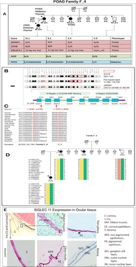 Detailed analysis of a POAG family. (A) Figure showing pedigree of the members of F_4 POAG family and the probable genotypes identified from our study that may be associated with the disease. The gene variations in pink and blue colors represent heterozygous variation in cases and homozygous reference in healthy. The gene variations in green represent homozygous alternate in JOAG, heterozygous variation in POAG and homozygous reference in healthy. Candidate gene SRFBP1: (B) A representation of the GLC1M loci (region first reported: 5q22.1-q32) of POAG. A fine-mapped region on the chromosome is also drawn. GLC1M loci harbor the candidate gene SRFBP1. The gene consists of eight exons and two functional regions, one of them being the SRF binding region. (C) The two variations identified in our cohort and their conservation across species. Both the changes are present in the SRF binding region (D) The haplotypes identified by the SNPs around the p.E12Q variation. The yellow haplotype segregates with the POAG phenotype in the family. The individuals marked with a star (*) underwent whole exome sequencing (E) Expression of Siglec11 in the human eye: Immunohistochemistry of SIGLEC11 revealed its expression in dilator muscles of the cornea, epithelium of the ciliary body and pars plana.
