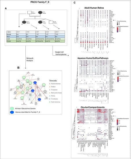 Detailed analysis of PACG family. (A) Figure showing pedigree of the members of F_9 PACG family and the probable genotypes identified from our study that may be associated with the disease. (B) Interaction of the known glaucoma genes that are associated with lipid metabolism (green circles) with the candidate genes ACACB, LDLR and PCSK9 identified in family F_9 (blue circles). Indirect interactions are also observed via other genes (gray) involved in the lipid metabolism and cholesterol pathways. The edges represent the type of interaction in the network, as is represented in the right panel. (C) Single-cell expression analysis of candidate genes in F9 family. The black arrows represent the above-discussed candidate genes in the family.