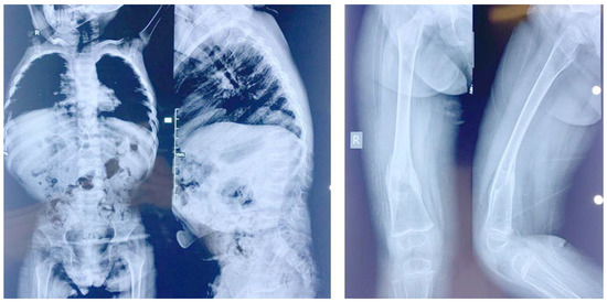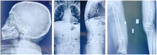 X-rays of patient 1 showing thinning of the occipital bone, abnormal vertebrae, kyphoscoliosis, femoral fractures, and bone demineralization.