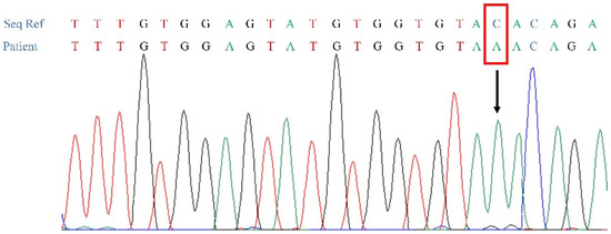 Whole exome sequencing (WES) was carried out in the patient. The exome was captured and enriched using the solution Agilent SureSelect Human All Exon kit version 5.0, and samples were then multiplexed and subjected to sequencing on an Illumina HiSeq 2500 PE100-125. Reads files (FASTQ) were generated from the sequencing platform via the manufacturer’s proprietary software. Reads were aligned to the hg19/b37 reference genome using the Burrows–Wheeler Aligner (BWA) package version 0.7.11 [8]. Variant calling was subsequently performed using the Genome Analysis Tool Kit (GATK) version 3.3 [9]. Variants were called using high stringency settings and annotated with VarAFT software 1.61 [10] containing information from dbSNP147 and the Genome Aggregation database (gnomAD, http://gnomad.broadinstitute.org accessed on 1 September 2021). Only nonsynonymous coding and splicing variants found in the patient were considered. Variant filtering was then performed based on the frequency of the variant in the gnomAD database (<0.01% and <50 heterozygous carriers or <5 homo-/hemizygous carriers), and in our in-house database (<1 homozygous occurrence), whereby only rare variants were selected. Additional filtering was carried out according to the mode of inheritance of the disease in the family. Indeed, considering the recessive inheritance of the disease in the pedigree and consanguinity, we assumed identity by descent and thus selected only homozygous variants.