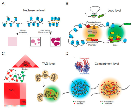 The site for storing genetic information in eukaryotes is the nucleus, and chromatin is accommodated in its limited space through multi-level organization and compaction. Three-dimensional chromatin structure is highly correlated with multiple processes, including correct gene expression, DNA replication and so on. In order to gain deep insights into 3D chromatin organization, two kinds of methods have emerged. One is based on the microscope approach, and the other is based on high-throughput sequencing. These methods deepened our understanding of the 3D genome, and proved that chromatin organization is highly degree ordered and unevenly distributed in space [1,2]. The genome enriches RNA factors and proteins into chromatin subcompartments with a diameter of about 0.1–1 µm to complete self-organizations [3,4]. An important example is that the transcription-activated euchromatin and the inactivated heterochromatin are clearly divided into different regions in the eukaryotic nucleus [5]. In addition to genetic material, proteins are also not evenly distributed in the nucleus. It is well known that specific proteins are concentrated in nuclear bodies, such as nucleolus and nuclear speckles [6,7]. These higher concentrations of enzymes and cofactors facilitate complex biochemical reactions.