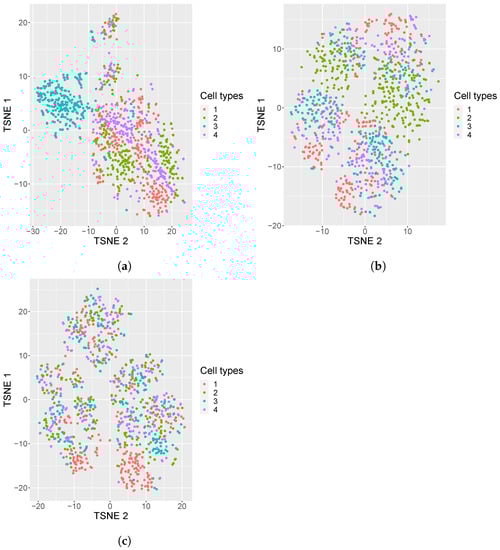A scRNA-seq simulator, Splatter [27], is used to generate simulated data. To mimic real scRNA-seq count data, which are usually very sparse (i.e., with excessive zeros), we used high dropout rates in the simulation. In scRNA-seq, dropout is used to denote the phenomenon where certain genes are not detected or are under-represented in certain cells due to limitations in the sequencing technology. This may lead to missing data in the scRNAseq dataset, which can introduce noise and bias into the downstream analysis [28,29,30]. These missing data are replaced with zero in the standard protocols for scRNA-seq data analysis. Each such dataset is represented as a cell–gene matrix, with genes as columns and cell samples as rows. In our simulation study, each simulated dataset (called count matrices) contains 1000 cells and 800 genes with equiprobable four cell types. The sparsity of each dataset was roughly . Here, sparsity is defined as the percentage of zeros in the count matrix. We generated 50 replicates of simulated datasets under this setting (i.e., zeros and equiprobable four cell types)). Further, to investigate the impact of imbalanced cell classes, we generated 50 replicates of simulated datasets with 95% sparsity and four imbalanced cell classes (i.e., types): 5%, 15%, 35%, and 45%. Each class represents a cell type. More details about the generation of the simulated dataset can be found in the supplementary material.