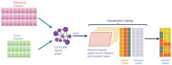 Attention-based Graph Neural Network (AGN) is a type of graph neural network that removes the intermediate fully-connected layers and replaces the propagation layers with attention mechanisms that respect the structure of the graph. This attention mechanism allows us to learn an adaptive and dynamic local summary of the neighborhood to achieve more accurate predictions. Our proposed method, scAGN, employs AGN architecture where single-cell omics data are fed after batch-correction using canonical correlation analysis and mutual nearest neighborhood (CCA-MNN) [47,48] as explained above. scAGN uses transductive learning to infer cell labels for query datasets based on reference datasets whose labels are known or have been annotated by experts. The illustration of scAGN is shown in Figure 3. We split the dataset in the ratio of 3:1 (), where 75% of the dataset acts as a reference dataset and 25% of the dataset acts as a query dataset. We perform transductive learning on a graph constructed using CCA-MNN, where some labels (such as cell types, diseased/unhealthy cells, etc.) are known and some are not known (Figure 3).