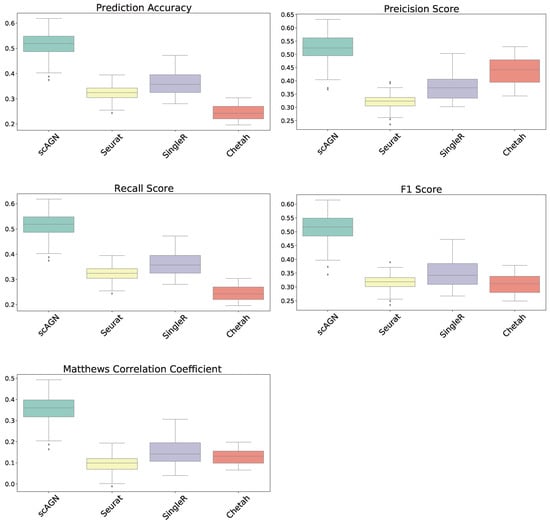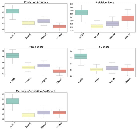 For datasets with a sparsity of and four equiprobable classes, the boxplots show that the proposed method scAGN surpasses all the other methods in terms of all five evaluation metrics; Seurat came second while SingleR and Chetah were third and fourth, respectively; scMAP-cell and scMAP-cluster did not work with such high-sparsity datasets. For the simulated data with a sparsity of and four equiprobable classes, the proposed method scAGN outperformed the existing methods (see Figure S1 in the Supplementary). We also conducted a simulation study where Splatter parameter de.prob was set to 0.5. Figure S2 in the Supplementary indicates that scAGN was superior to that of all baseline methods for this case as well.