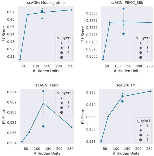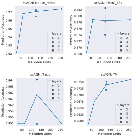A neural network architecture plays a crucial role in determining the predictive power of a neural network classifier. Finding the best neural architecture is important for the superior performance of a neural network classifier. For scAGN, a neural network classifier, hidden units, and the number of layers matter. While we did not perform any hyperparameter search for the best neural network, we varied the number of hidden units and the number of layers to study the trend of performance with hyperparameters such as the number of hidden units and the number of layers. We visualize the impact of the number of hidden units and the number of layers on the prediction accuracy and F1 score for healthy cells (Figure 8 and Figure 9). The impact of the number of hidden units and the number of layers on these two performance metrics for all 12 datasets can be seen in Figures S3 and S4 in the Supplementary. In general, we found that, with an increase in the number of hidden units, the prediction accuracy as well as F1 score improve as we increase the number of neurons. Having a too little number of hidden units can cause underfitting, while it should also be noted that using too many hidden units can cause overfitting and the model becomes less generalizable. Increasing the number of layers did not have a significant impact on the performance metrics of the scAGN classifier.